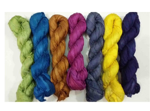 Recycled silk ribbon yarn is the by-product of the colorful saris that women wear in South Asia. It is the loose ends of saris collected from industrial mills in India that are hand spun into yarn in villagers. The vibrant colors and unique texture of these silk fibers and silk yarn are inspirational to designers, knitters, and artisans of all types. The popularity of recycled silk yarn has extended beyond India and has created an empowering cottage industry primarily benefiting women. This yarn is made of completely recycled sari material from recycled clothing in India.
